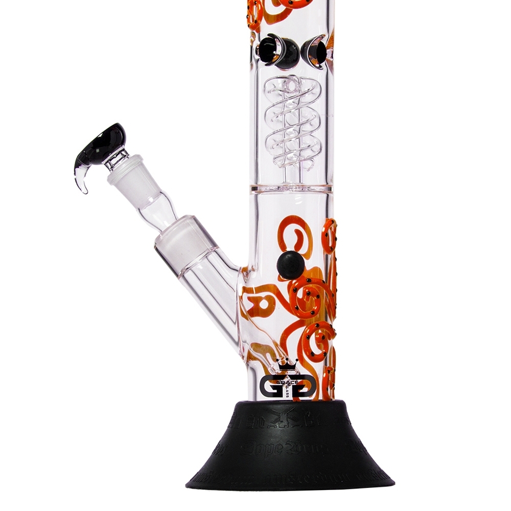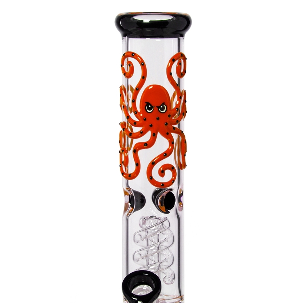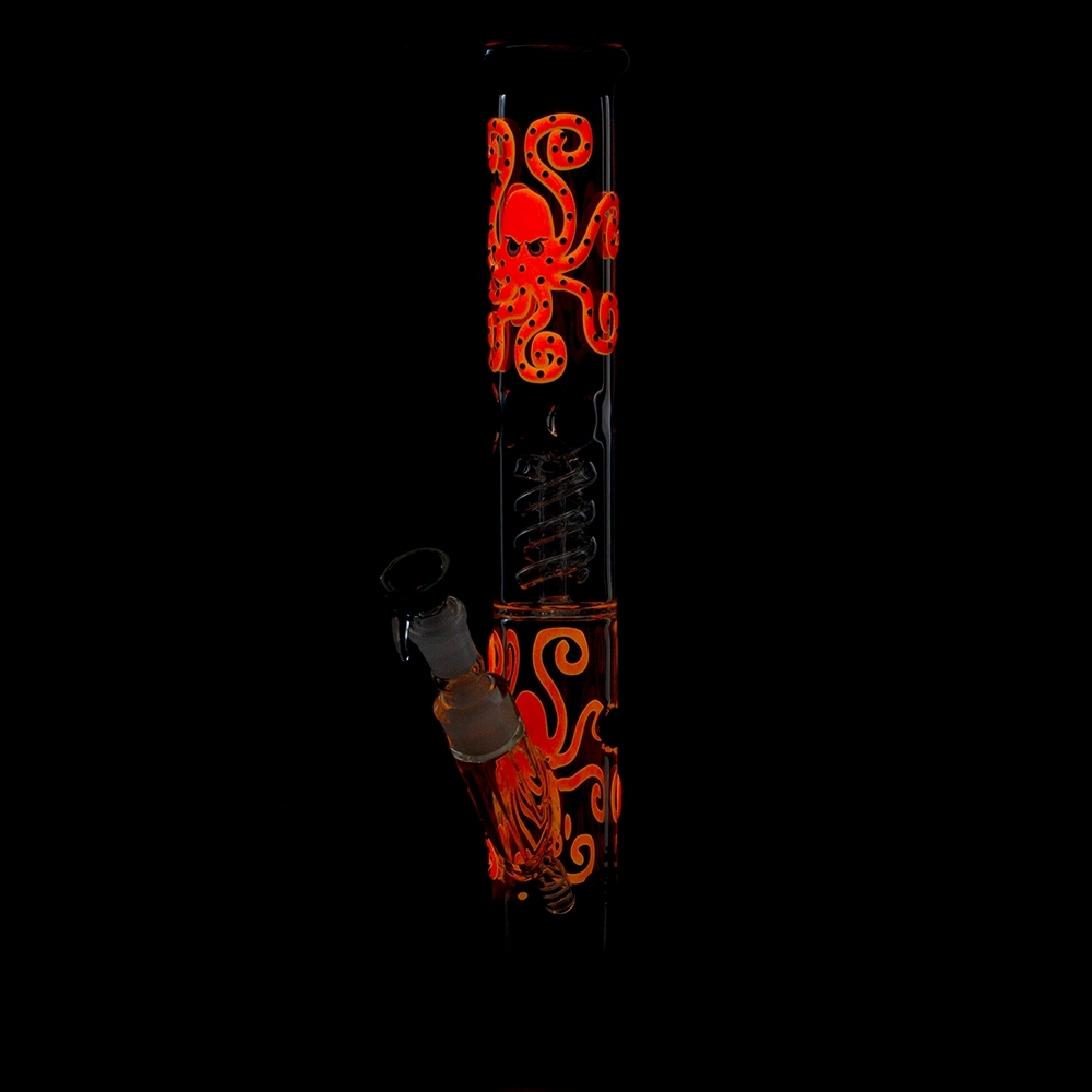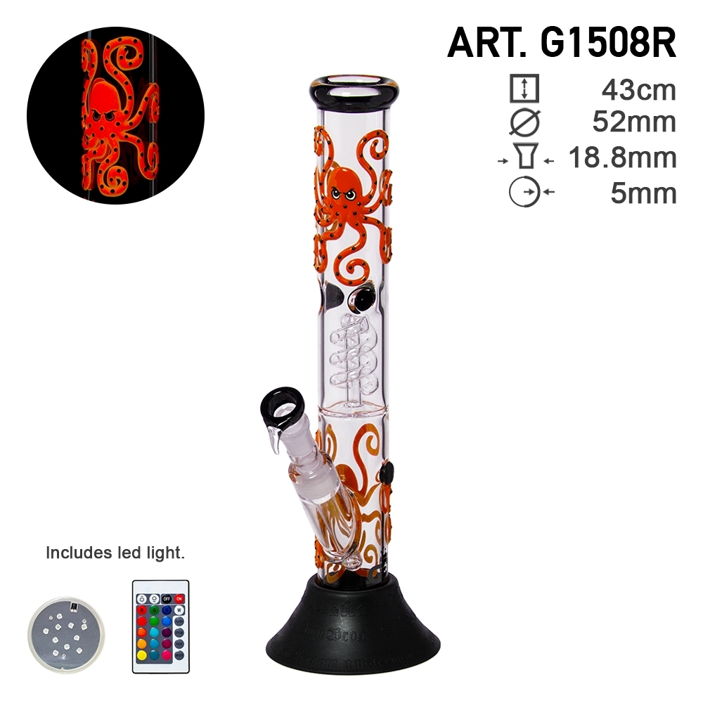 To niesamowite bongo z serii Grace Glass Octopoda to wyjątkowa fajka wodna wykonana z wysokiej jakości szkła borokrzemianowego. Ściana ozdobiona czerwoną ośmiornicą, posiada również wyjmowaną silikonową podstawę. Wyposażony w spiralną komorę perkolatora oraz lodową, które zapewniają chłodniejsze doznania podczas palenia. Wysokość 43 cm i uchwyt miski męskiej 18,8 mm zawiera również zestaw LED. Ta seria bong rozświetli także Twoje noce, świeci w ciemności!